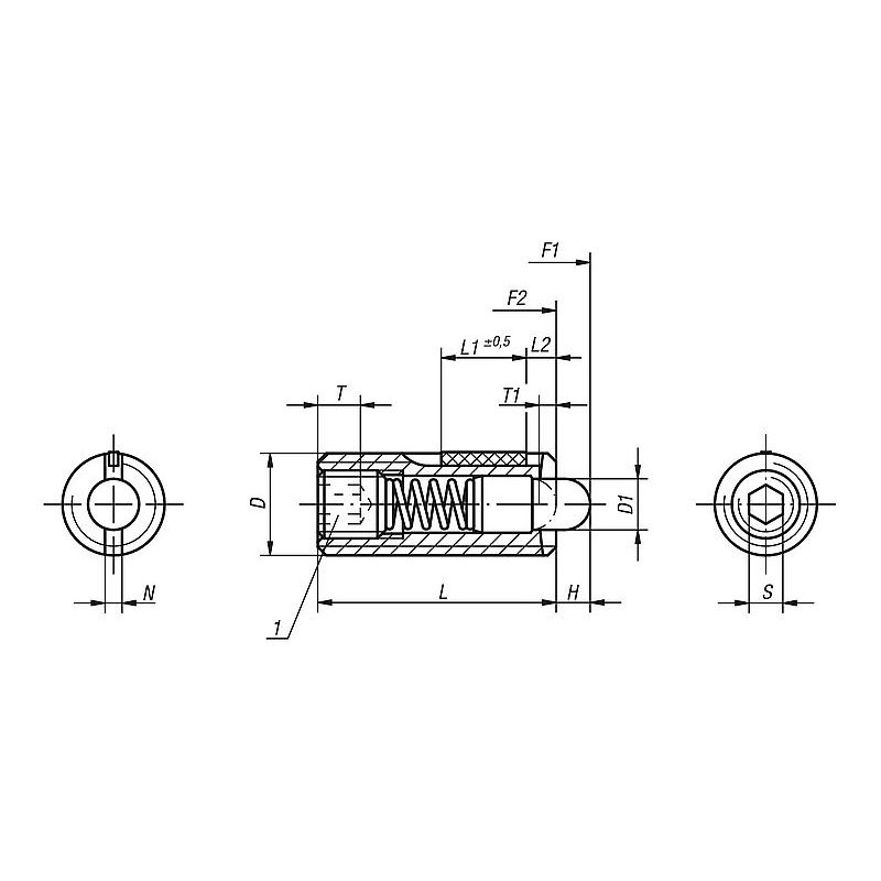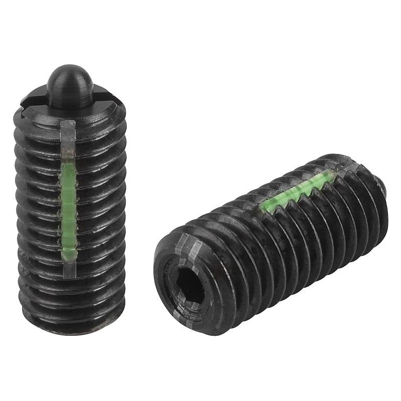 03041_VF – Altıgen soketli ve baskı pimli bilyalı setiskur vidalar, çelik, artırılmış yay kuvveti, diş kilidi ile