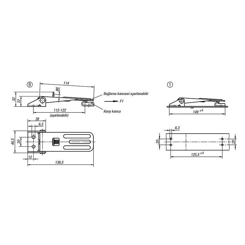 Tutma kuvveti F1, karşı kancaya değil, gerdirme mandalına ilişkindir.