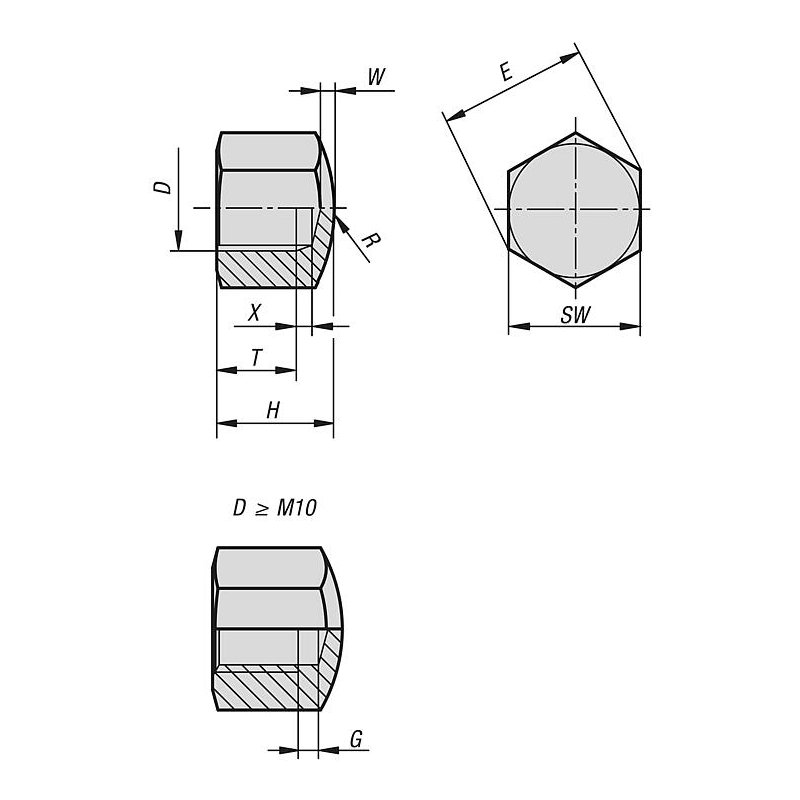D = M10 itibariyle başlıklı somunlar DIN 76-1 Form D uyarınca bir diş alt kesime sahiptir.