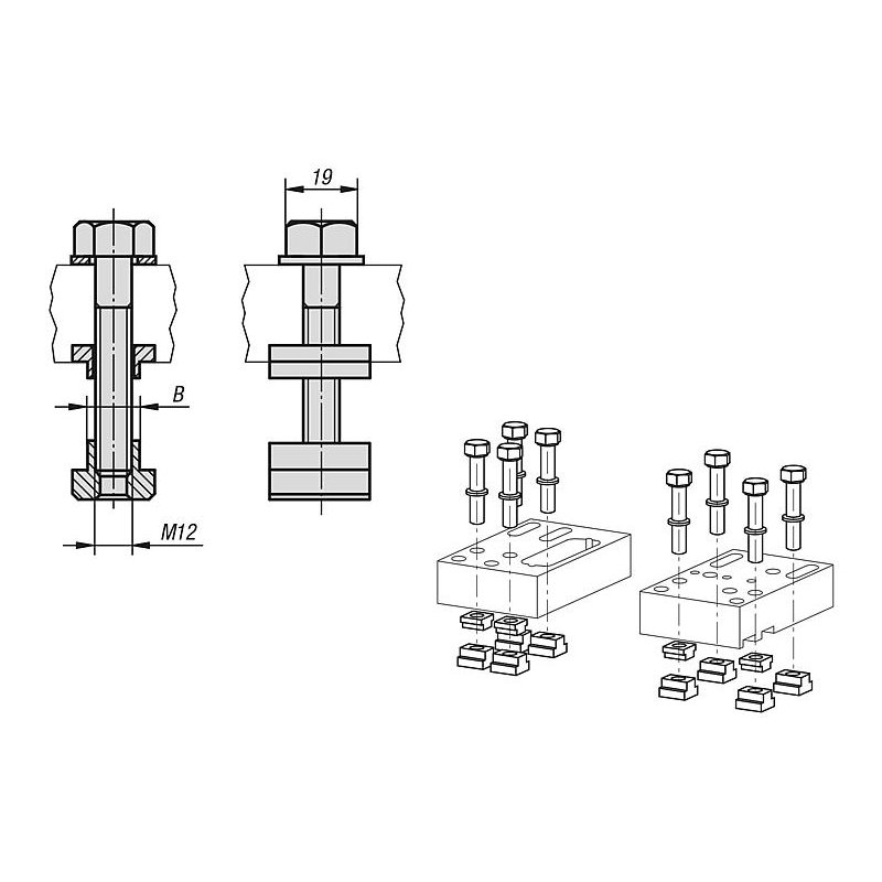 3 ve 5 akslı bağlama elemanlarını, 14 veya 18 boyutunda T kanallı tezgahlar üzerinde hizalamak ve tespitlemek için sabitleme seti.