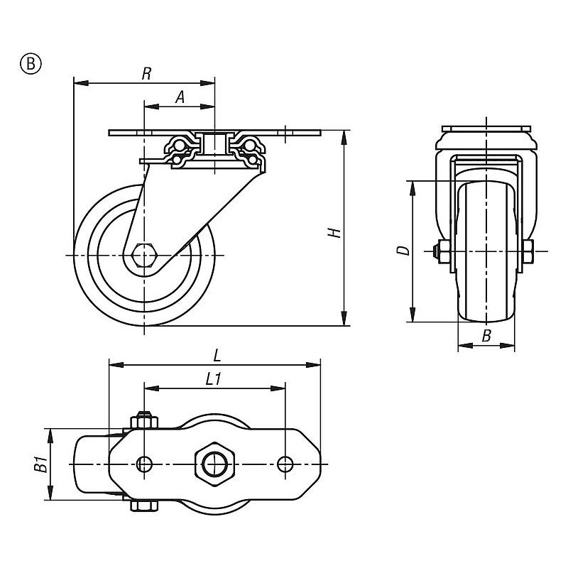 Yüksek kaliteli termoplastik polipropilenden (TPE) üretilen lastik sırtı 85° Shore A sertliğe sahiptir ve polipropilen bir tekerlek merkezi üzerine kalıplanmıştır. Lastik sırtı iz bırakmaz ve tekerlek merkezi ile ayrılmaz, malzeme kilitli bir bağlantı oluşturur. Termoplastik kauçuk elastomerden yapılmış tekerlekler, çok düşük yuvarlanma ve direksiyon direnci ile karakterize edilir.