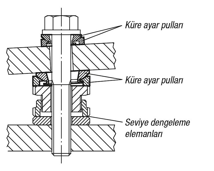 Çanak dengeleme pulu, montaj sırasında yaklaşık 4° açıya kadar eğimli dayanma yüzeylerinin oluşturulmasını sağlar. Eğimli konum D3 > 1° olduğunda, cıvataların yüzeyin her yerine eşit dayanması için altlık olarak bir adet daha çanak dengeleme pulunun kullanılması önerilir. Üst ve alt parça birbirlerinden ayrılamaz, bunlar birbirlerine sabitlenmiştir.