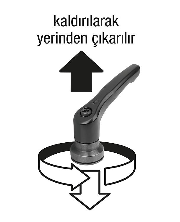 Tutma kolu devreye alınmamış durumda dişli çember aracılığıyla dişli elemana oturtulmuştur. Tutma kolu kaldırılarak pozisyonu değiştirilebilir ve yay gücü ile tekrar dişli çemberine oturtulabilir.Kullanım:Makine, cihaz ve tesis yapımı, rehabilitasyon alanı.