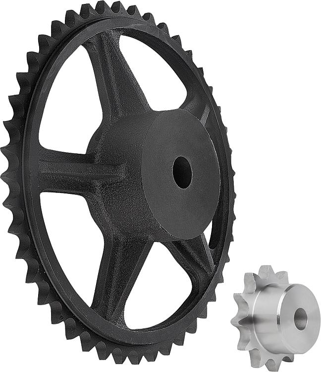 DIN ISO 606 uyarınca makaralı zincirler için tek taraflı göbekli zincir çarkları. Zincir çarklarında önceden açılan delikler mevcuttur.